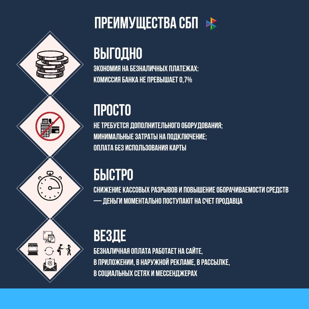 Система быстрых платежей — важнейший инфраструктурный проект национального значения, направленный на содействие конкуренции, повышение качества платежных услуг, расширение финансовой доступности, снижение стоимости платежей. В настоящее время в СБП реализована возможность совершать переводы между счетами граждан, а также платежи в пользу юридических лиц, например, за товары и услуги, в том числе с использованием QR-кодов.