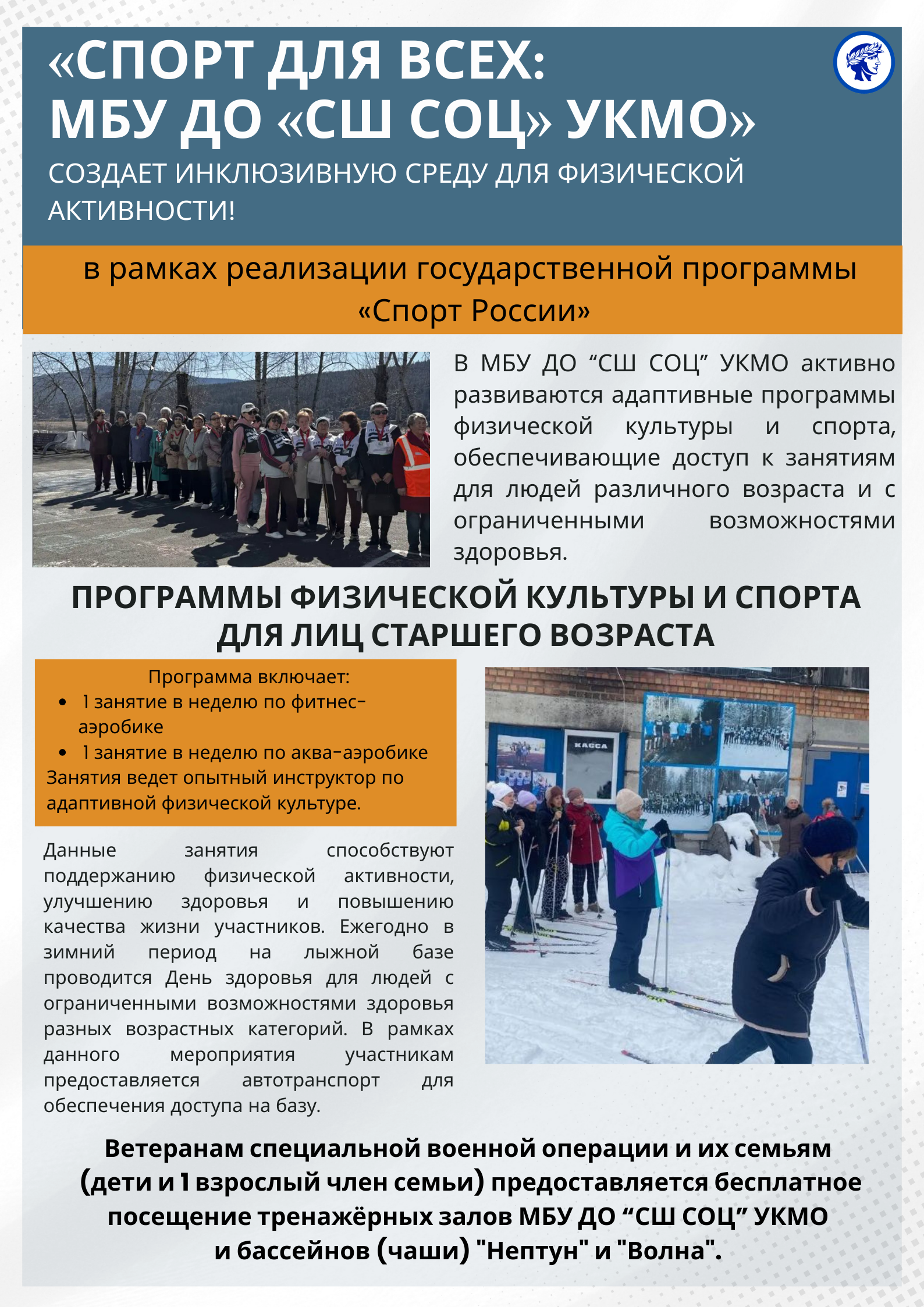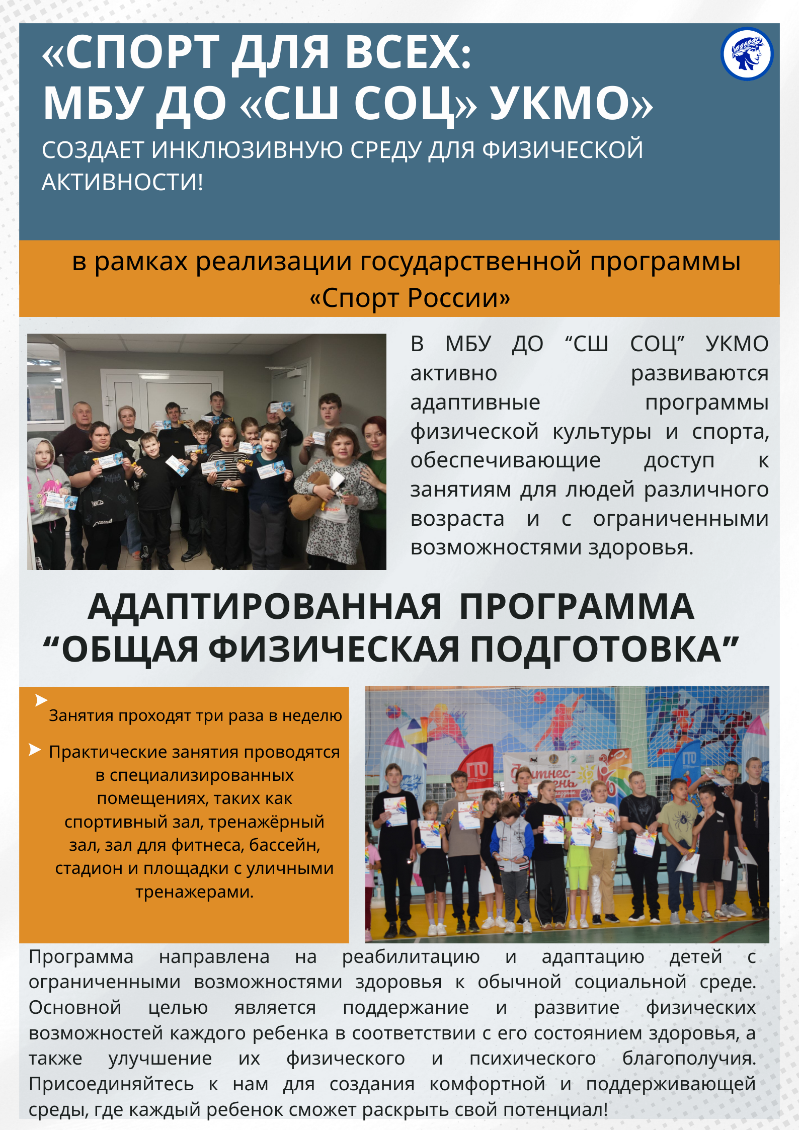 В МБУ ДО «СШ СОЦ» (https://shsoc-ukmo.profiedu.ru/?section_id=37) мы предлагаем разнообразные программы и инициативы для всех категорий населения! Приходите и занимайтесь спортом с нами – для здоровья, радости и активной жизни!