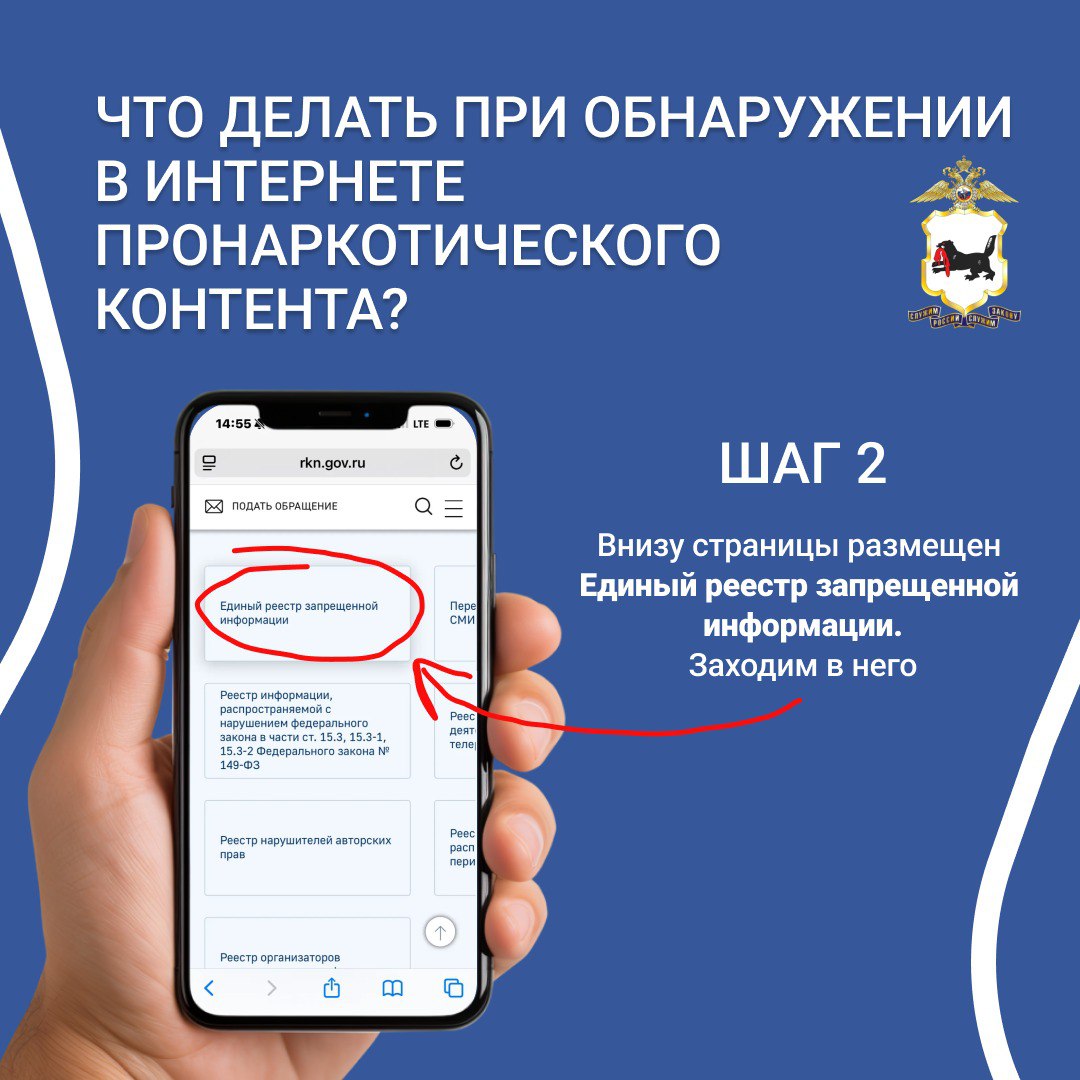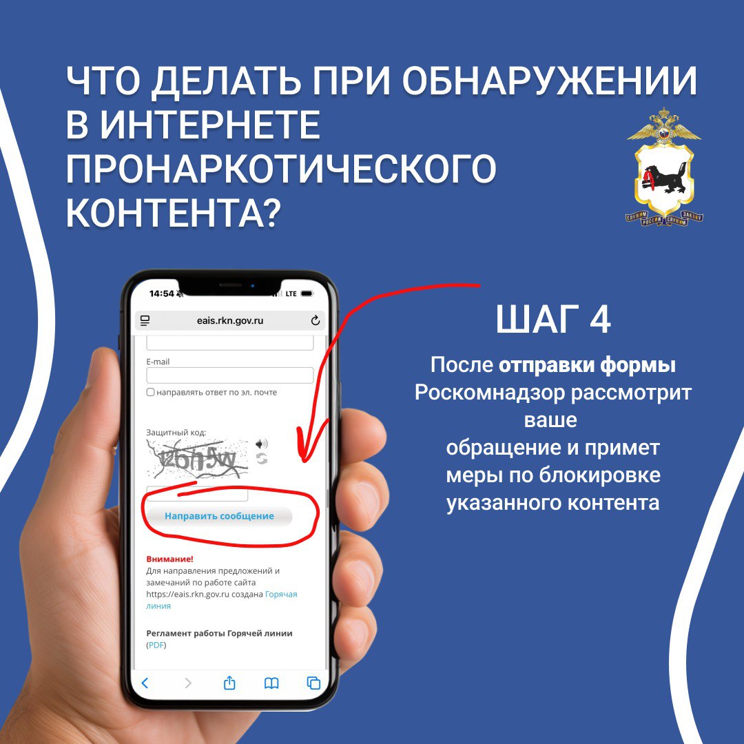 При обнаружении интернет-ресурса, содержащего признаки пропаганды наркотических средств, необходимо направить сообщение в Федеральную службу по надзору в сфере связи, информационных технологий и массовых коммуникаций (Роскомнадзор) для внесения ресурса в Единый реестр запрещённой информации. Для этого необходимо заполнить специальную форму на официальном сайте Роскомнадзора или воспользоваться мобильным приложением службы.