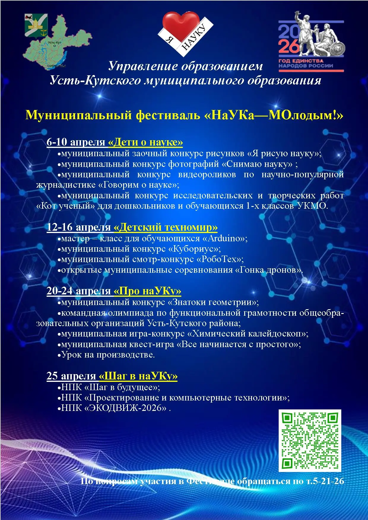 С 6 по 25 апреля школьников Усть-Кутского района ждёт настоящее погружение в мир науки и открытий — первый муниципальный фестиваль «НаУКа – МОлодым!»